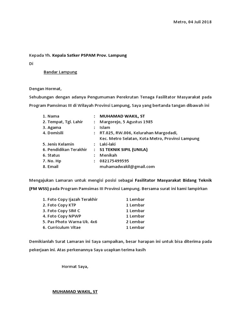 Contoh surat lamaran pamsimas kalimantan selatan :